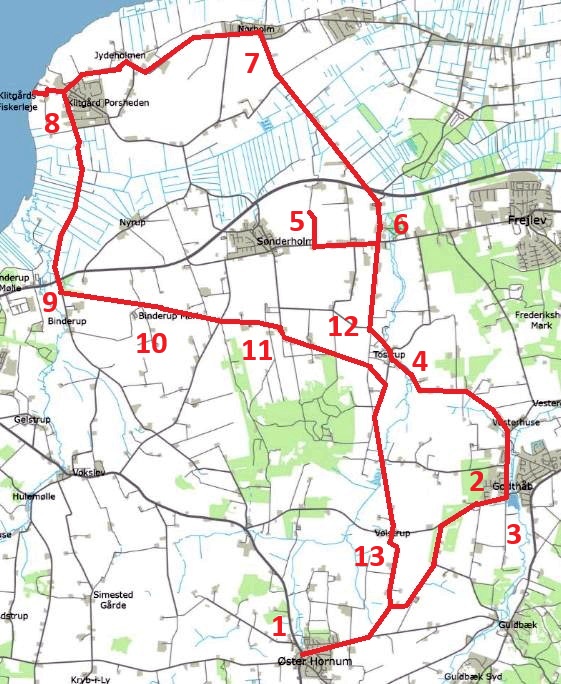 Rute gennem Godthåb, til Troldkirken ved Sønderup og videre gennem Nørholm til Klitgårds Fiskerleje. Turen tilbage til Øster Hornum går ad Bjergbanestien til Tostrup.
